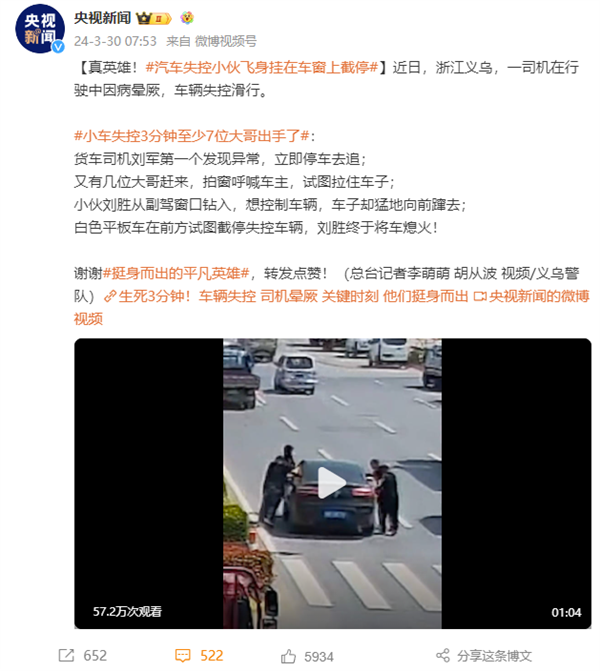 央视点赞!汽车失控小伙挂车窗上截停:救了司机一名