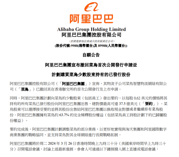 斥资270亿元收购股权!阿里撤回菜鸟上市申请