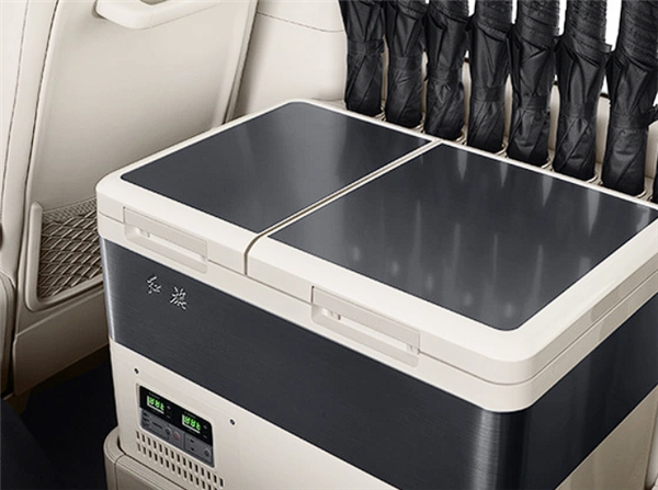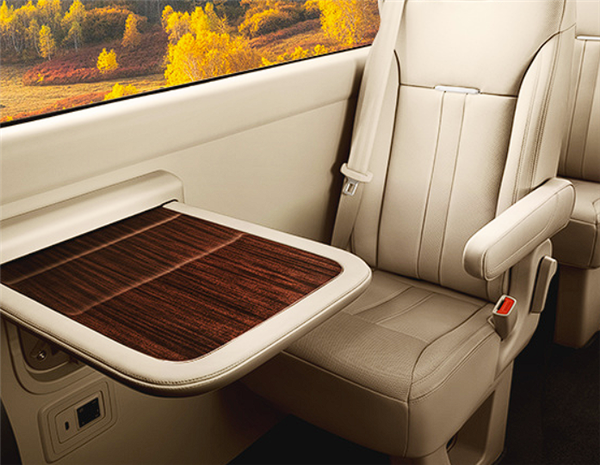 旗舰版第二排座椅还带有办公桌、杯架、220V电源、车载冰箱、隐藏式雨伞架、空气净化器等。