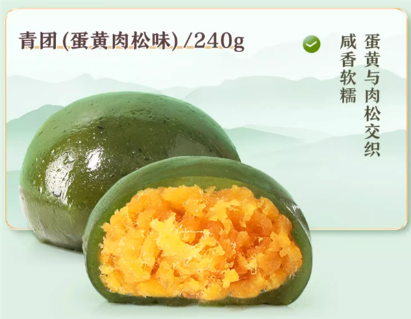 产品规格:可选豆沙味、蛋黄肉松味两种口味,添加真艾草,蛋黄肉松味咸香软糯,豆沙味清甜不腻,艾草外皮紧裹内陷,Q弹、鲜、糯。
