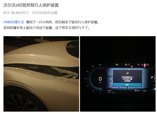 日前,有沃尔沃S60车主发文称,他晚上驾车时撞到了一只小狗,小狗没有受到太大伤害,撞倒后叫了两声就跑了,但他车辆的行人保护装置触发,前机舱盖弹了起来。