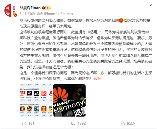 近日网络上流传着一则消息,声称华为鸿蒙操作系统与微信的合作谈判陷入了僵局,这一消息进一步加剧了人们的关注度。