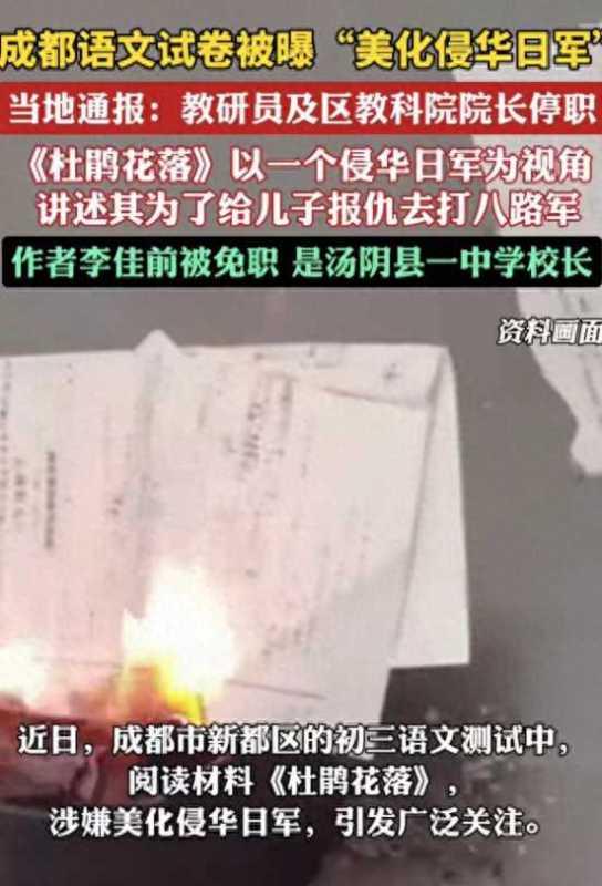 近日,教育界出了一件大事,成都新都区初三年级的语文试卷上,一篇名为《杜鹃花落》的阅读文章被指涉嫌“美化侵华日军”,目前试卷已被收回销毁,“毒试卷”一事引起网友强烈热议与愤怒。