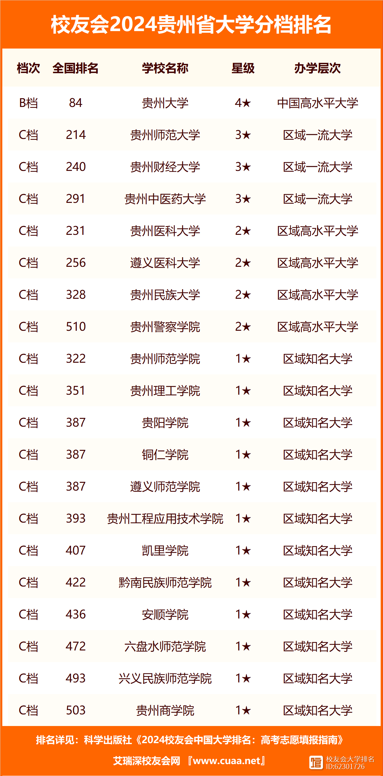- 2024年贵州省大学排名一览表中,贵州大学以全国排名84位、4星级、中国高水平大学的评级位列贵州省第一。