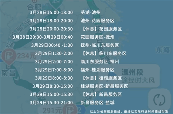 而续航挑战的路程规划,是于3月28日从芜湖池州出发,途径抚州、临川、福州、新昌,最后在3月29日21:00左右,到达江苏盐城,总路程超过2000公里。