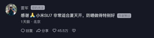 令人意外的是,雷军亲自回复:“感谢,小米SU7非常适合夏天开,防晒做得特别好。”