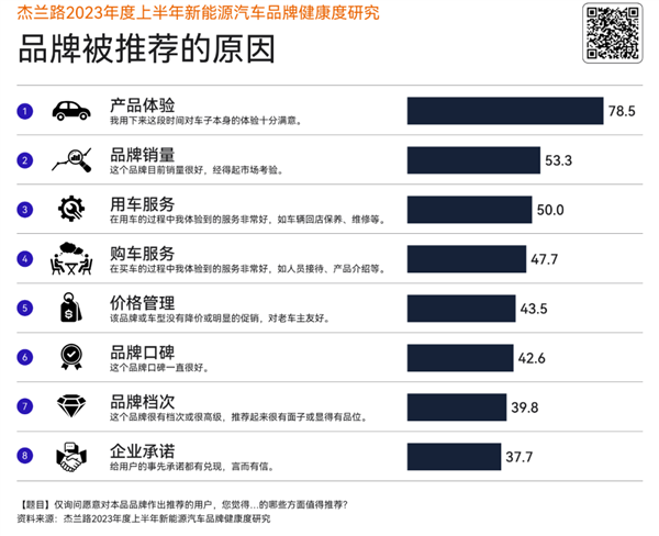 相比于传统品牌,新势力品牌及车型的用户NPS更高,品牌NPS是用户中每百人中推荐者的数量减去贬损者的数量。从数据来看,新势力品牌的用户口碑明显高于传统品牌。据杰兰路公布,用户推荐品牌的原因主要集中在以下几方面:产品体验好、品牌销量好、用车服务和购车服务好、价格管理、品牌口碑、品牌档次和企业承诺上。