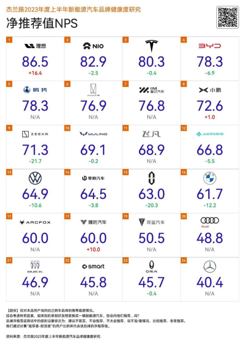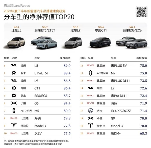 根据国内权威机构杰兰路发布的《新能源汽车品牌健康度研究》报告,2023年上半年用户NPS前三品牌分别为理想、蔚来和特斯拉,比亚迪位列第四。下半年车型NPS中,理想L8位列第一,其次为蔚来ET5排名第二,第三位为理想L9 。同时,根据中国质量协会2023年中国新能源汽车用户满意度测评(NEV-CACSI)结果,理想L8、理想L9包揽了新能源汽车综合满意度指数总榜、增程式SUV单项榜两个榜单第一和第二名,用户满意度领跑新势力。