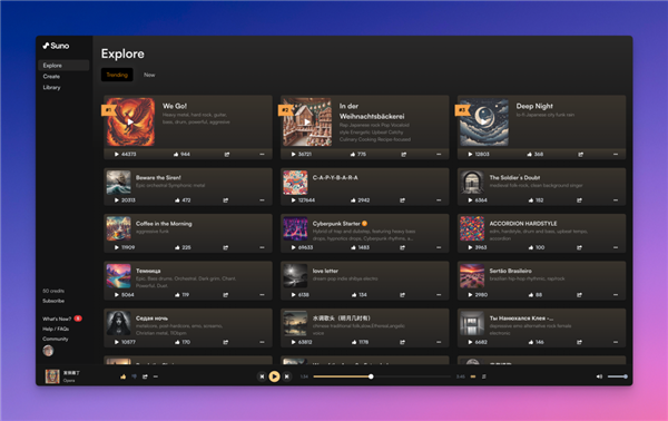 于是世超立刻打开 Suno 的网站试了试。结果这一试,我就打开了新世界的大门,正式走进了华语乐坛。Suno 的页面很简单,主要分为三大板块:探索、创作、音乐库。