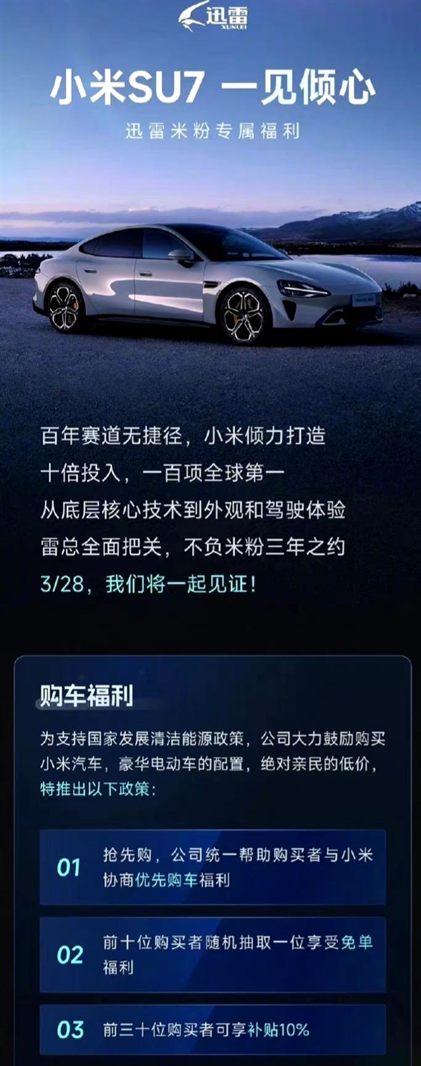 迅雷公司表示:为支持国家发展清洁能源政策,公司大力鼓励购买小米汽车,豪华电动车的配置,绝对亲民的低价,特推出以下政策: