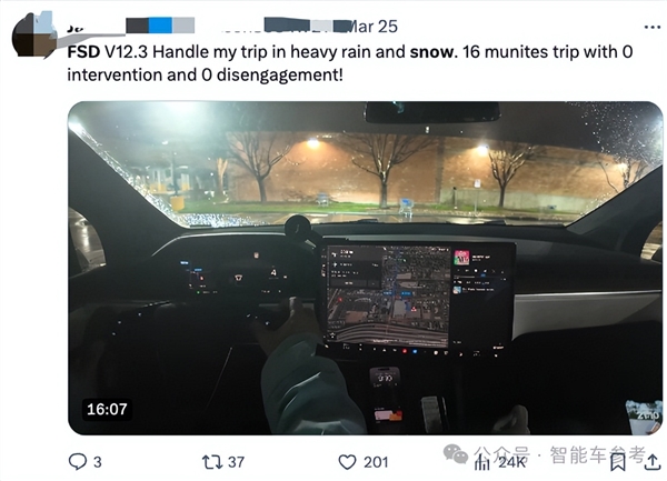 FSD前几天了更新了V12.3.1版本,车主上传的“民间小视频”显示,相比V12 Beta内测初期,FSD在雨雪天的表现,明显提高。
