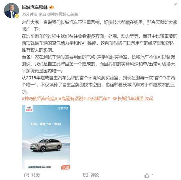 长城汽车总裁:长城自建风洞风速可达300km/h 比12级台风快近三倍