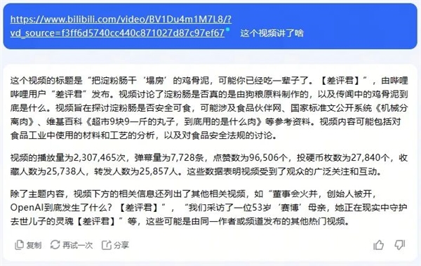 假如你发它一个视频链接,它只能给你分析整个网页上的文字在说啥,而不能总结视频里讲了啥。