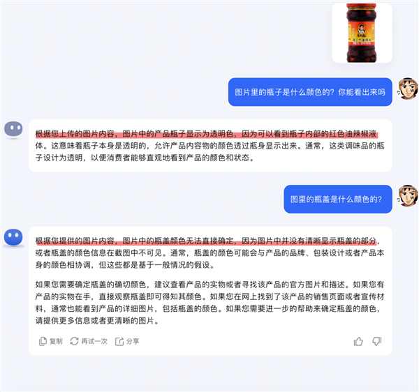 我发给它一瓶老干妈,问瓶子和瓶盖是什么颜色的。Kimi 回答有时正确,有时却像是还没长眼睛。