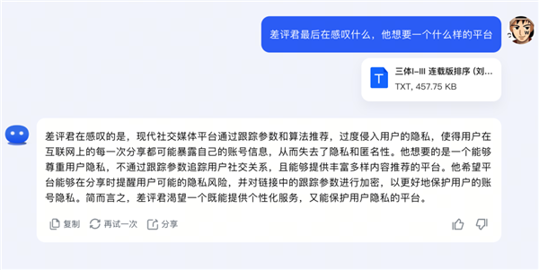 我再问他,在这本书里的三体文明到底是啥,它也回答正确。