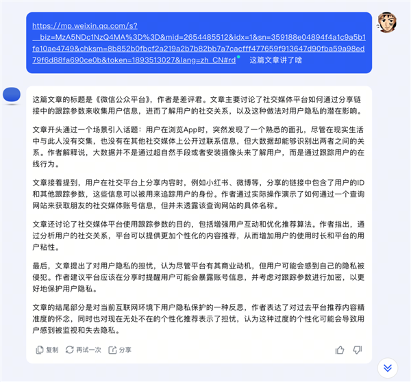 比如世超往它脸上甩了一篇 2500字的文章链接,让它总结。