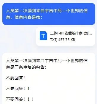 世超截取了 15 万字的《三体》,打包成 txt 文件发给它。接着问:人类第一次读到来自宇宙中另一个世界的信息,信息内容是啥。