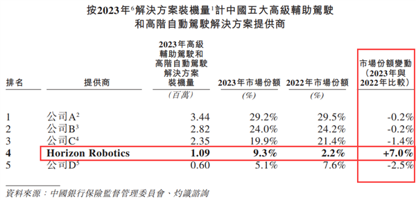 在高阶辅助驾驶及高阶自动驾驶领域,地平线的市占率也从2022年的2.2%迅速提升至2023年的9.3%(109万套),成为前五大供应商市场份额唯一上升的企业。