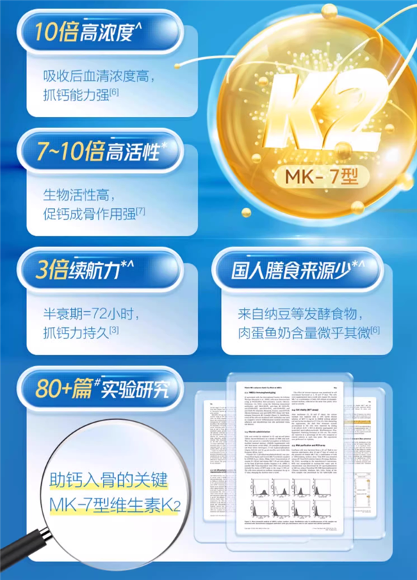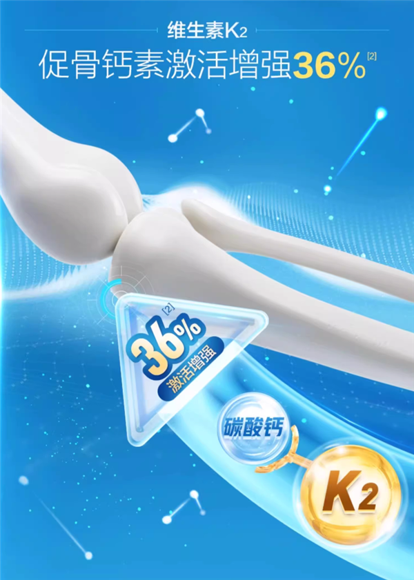 维生素K2可激活“捕”蛋白”,形成钙爪,捕捉血液中的游离钙和血管壁的沉积钙,将其输送到骨骼。