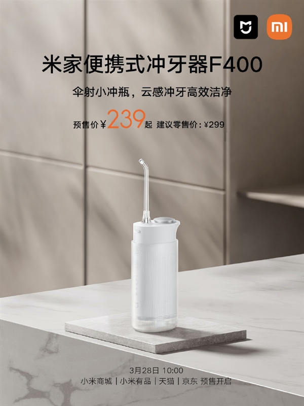 3月28日消息,小米米家便携式冲牙器F400目前已经上市,售价239元。