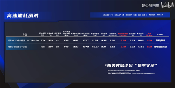 需要说明的是,由于节目制作时理想L9新款并未上市,所以此次对比采用的还是2022款L9,而问界M9自重更大(比L9重了110公斤)、后车轮胎更宽,在能耗方面处于下风,可以说双方对比后各有