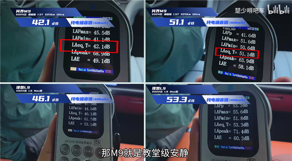 综合来看,问界M9分贝更低(更安静),燃油怠速、燃油行驶、纯电行驶、急加速状态下,均是问界M9表现更好,只有纯电怠速状态下,理想L9表现稍好。