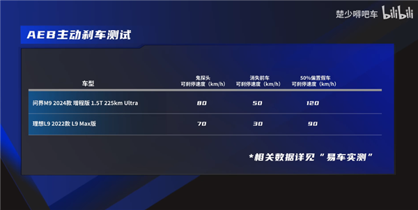 问界M9各项均优,鬼探头80km/h可刹停、消失的前车50km/h可刹停、50%偏置假车120km/h可刹停,2022款理想L9则是70km/h、30km/h和90km/h。