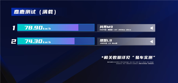 满载:理想L9:74.3公里/小时;问界M9:78.9公里/小时。
