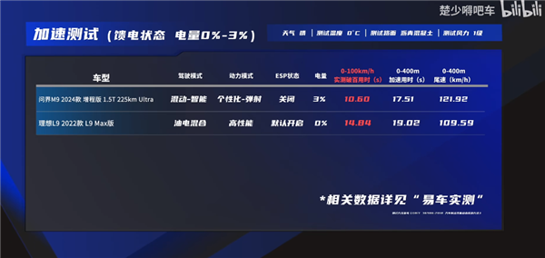 理想L9:14.84秒(电量0%);问界M9:10.6秒(电量3%)。