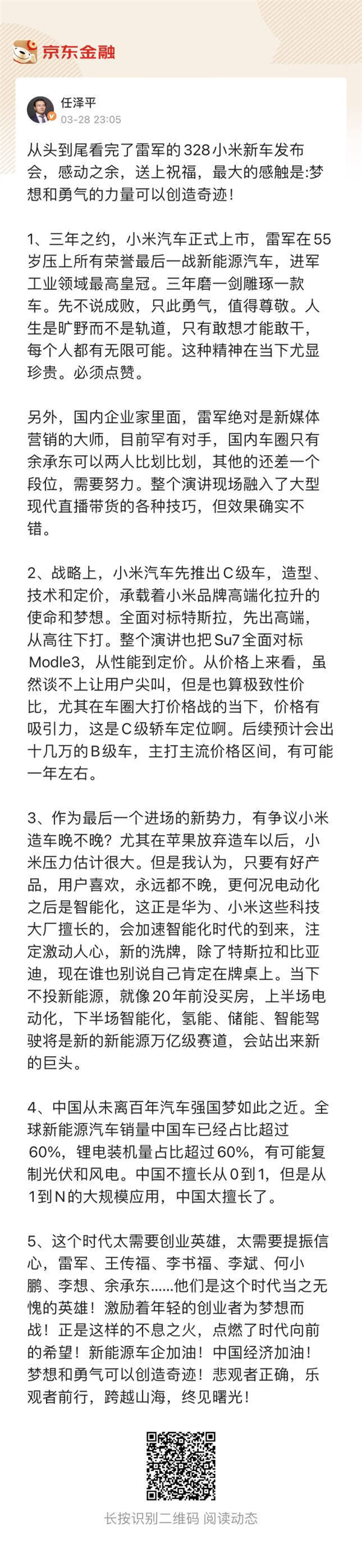 如此看来,任泽平高估了小米汽车的价格。在小米发布会后,任泽平在京东金融社区发帖称他“从头到尾看完了雷军的328小米新车发布会,感动之余,送上祝福,最大的感触是:梦想和勇气的力量可以创造奇迹!”