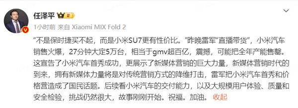 而后,任泽平还在微博上继续发文,高度评价小米汽车在新媒体营销方面的巨大能量,称雷军把小米汽车首秀和价格营造成了国民话题。“后续看小米汽车的交付能力,以及大规模用户体验、质量和安全建议,挑战依然很大,故事刚刚开始。祝福,加油。”