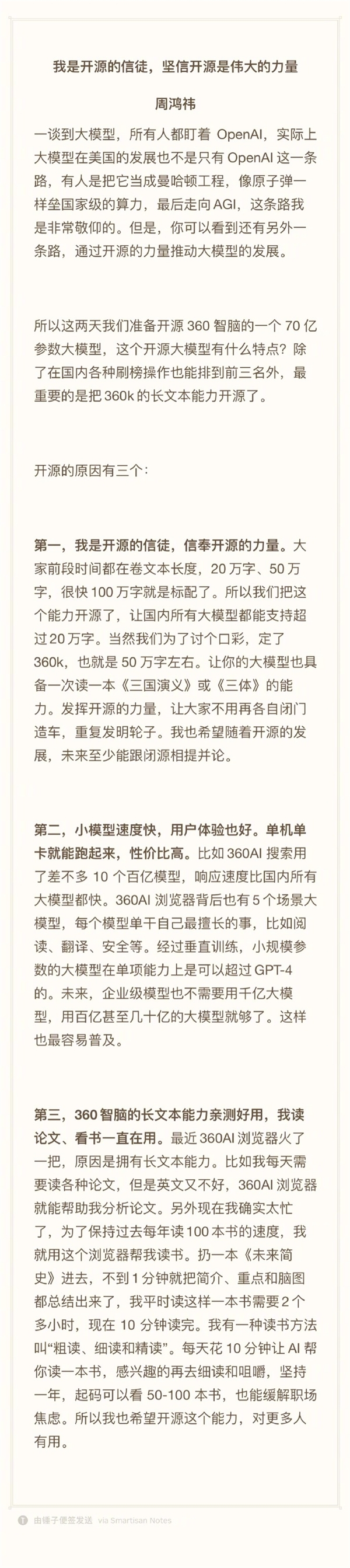 同时,他还宣布即将开源360智脑7B(70亿参数模型),支持360k(50万字)长文本输入。