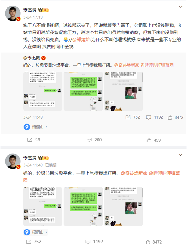 近日其再次发微博吐称参加综艺节目“奇迹焕新家”,表示花了120万装修,一年过去了,装修进度和效果都未达标。博主表示,如果4月还没弄好,将去B站楼下直播维权。