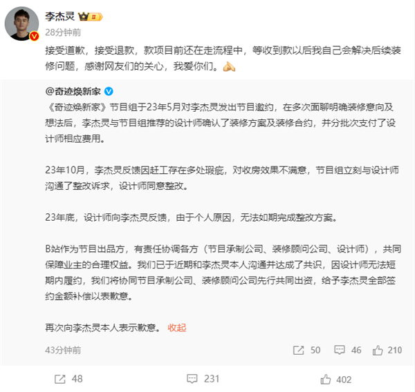 我们已于近期和李杰灵本人沟通并达成了共识,因设计师无法短期内履约,我们将协同节目承制公司、装修顾问公司先行共同出资,给予李杰灵全部签约金额补偿以表歉意。再次向李杰灵本人表示歉意。