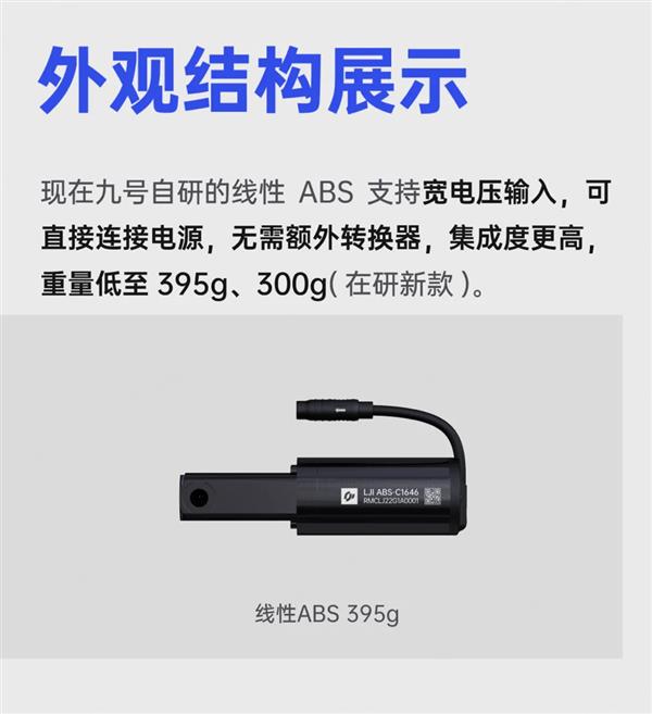 抱着创新科技成就美好生活的初衷,九号公司旗下零极创新自研了一款全新的线性 ABS, 最主要的目的是守护更多的两轮车车友。为了能广泛应用在国标车上,需要满足新国标对重量和安全的要求,零极创新从原理和结构上开始了全新的设计。