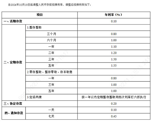 自2024年10月18日起调整人民币存款挂牌利率,具体情况如下:活期存款年利率从0.15%下调至0.10%;3个月、6个月、一年期、两年期、三年期和五年期整存整取定期存款挂牌利率分别下调0.25个百分点至0.80%、1.00%、1.10%、1.20%、1.50%和1.55%。