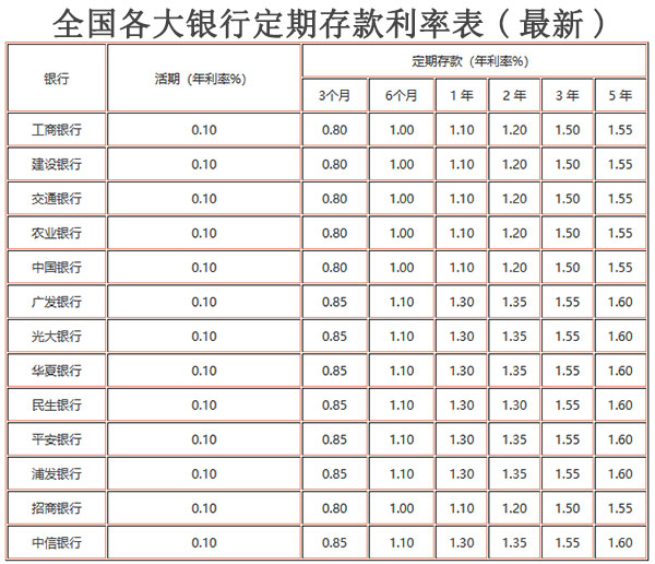 工商银行、农业银行、中国银行、建设银行、交通银行:活期存款利率均为0.10%。定期存款利率方面,3个月期为0.80%,6个月期为1.00%,1年期为1.10%,2年期为1.20%,3年期为1.50%,5年期为1.55%。