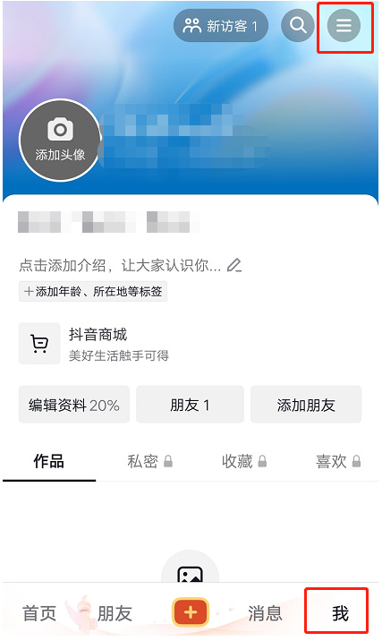步骤一:打开抖音APP,点击右下角的【我】-右上角的【三横】图标;
