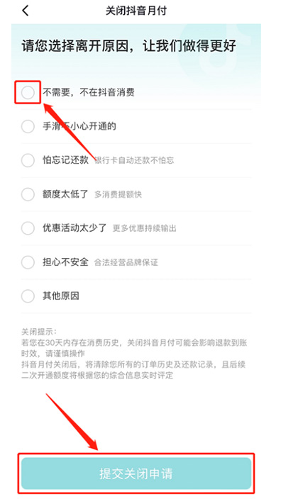 步骤八:选择关闭原因,点击【提交关闭申请】,系统审核通过后,抖音月付就能关闭成功。