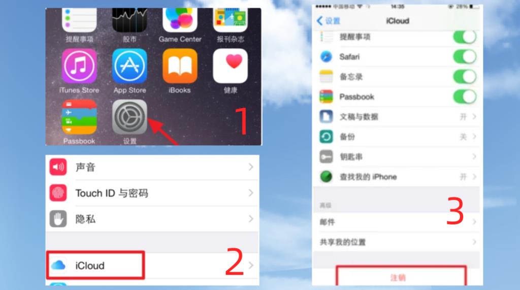 1、首先打开iPhone上的【设置】,找到【iCloud】,然后打开iCloud后,拉到最下面,点击【注销】