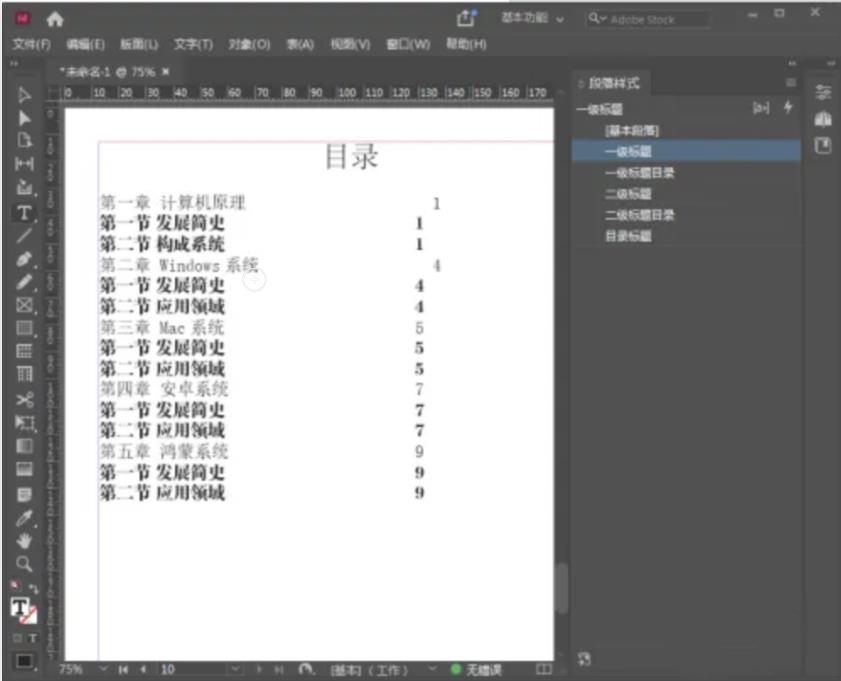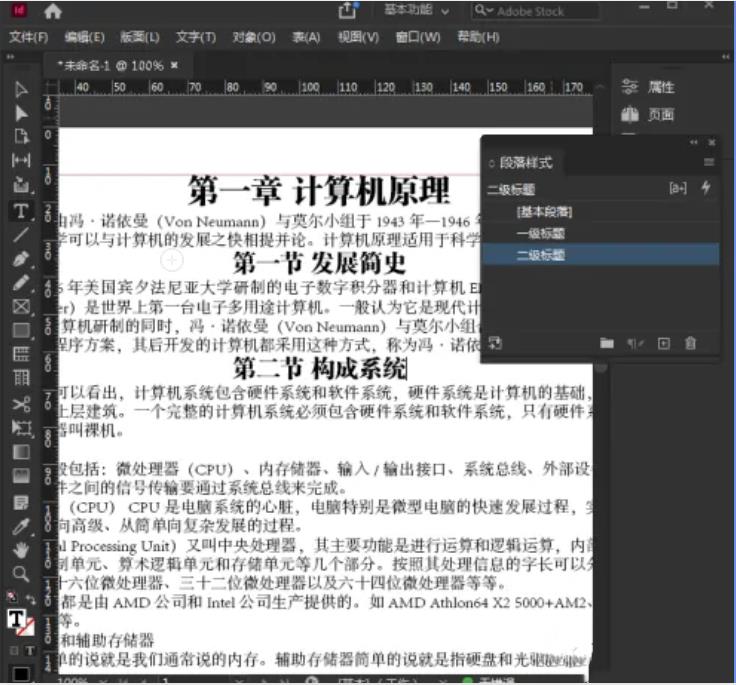 1、在InDesign中新建文档并导入文本,做目录之前最主要的就是在文档标题上应用段落样式,例如,文章一级标题、二级标题,甚至是三级标题,如图所示。