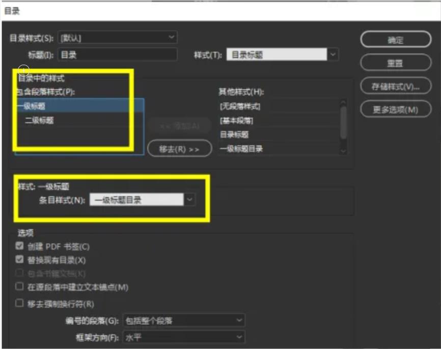 2、生成目录:执行【版面-目录】命令,在弹出的对话框中添加生成目录的段落样式,而且生成目录的每个段落样式都要指定一个目录标题的段落样式,这主要是为了便于统一目录版式,如图所示。
