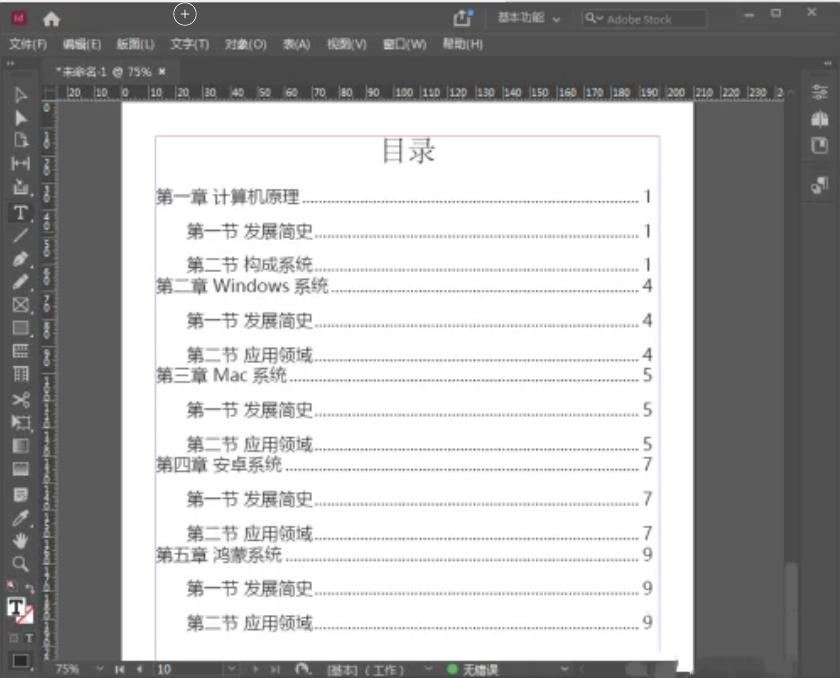 3、单击【确定】按钮后,鼠标光标变成置入文本标志,在目录内容放置页面上按Shift键自动排文即可生成目录内容,但是,目录内容尚未格式化,如图所示。