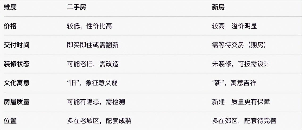 从对比来看,二手房在经济性和便利性上占优,但在文化意义和房屋质量上稍逊。新房更符合传统婚房需求,但高昂的成本可能让年轻夫妇望而却步。