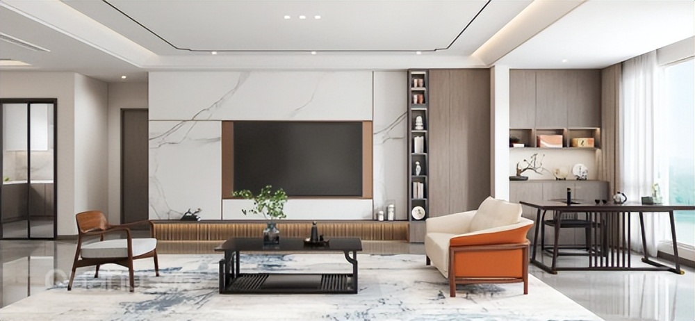客厅电视墙将时尚自然的大理石作为设计主体,又融入具有传统韵味的木质元素,现代与古典并存,以满足业主对新家的多元审美。
