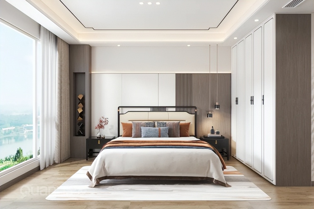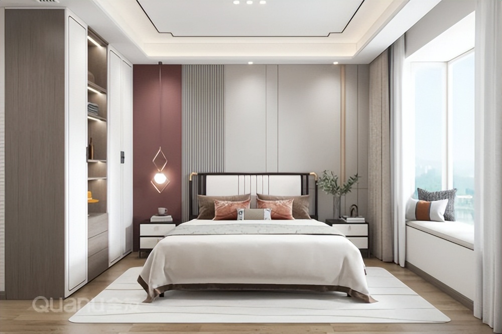 床头背景墙用拼接木饰面装饰,灯带设计灵动轻盈;靠窗处定制装饰柜,凹槽内摆放艺术品,极具设计感。