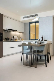 餐厨区域,L型厨房与岛台、餐桌相结合,简单却不失精致。轨道插座的巧妙融入,是实用与品味的双重体现,也为餐厅节省更多空间,让餐厅更整洁。一家人简单的一日三餐或邀请三五好友前来相聚,都能在这方小天地中轻松实现,尽享生活的美好瞬间。