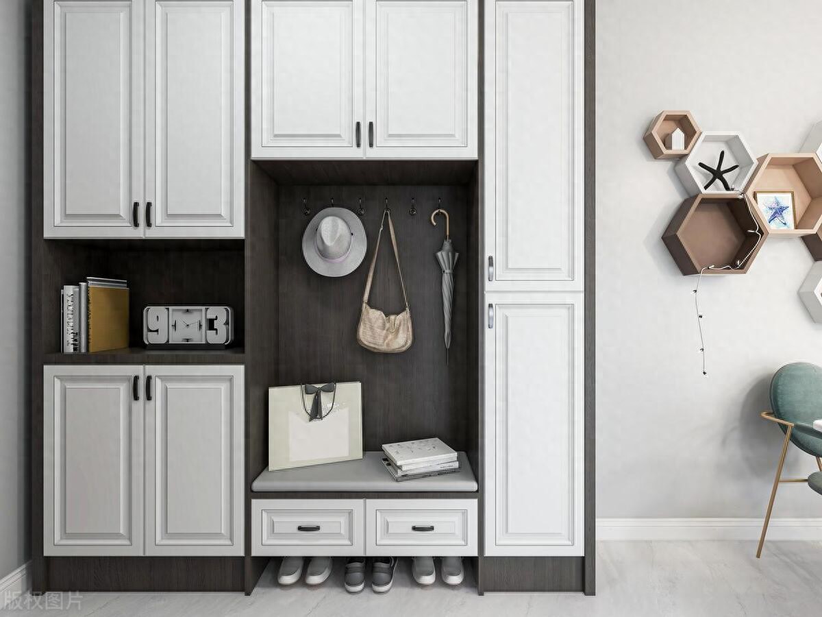 • 坐凳:设计带坐凳的鞋柜,更便于换鞋。坐凳下面可以是抽屉或开放式的储物空间。