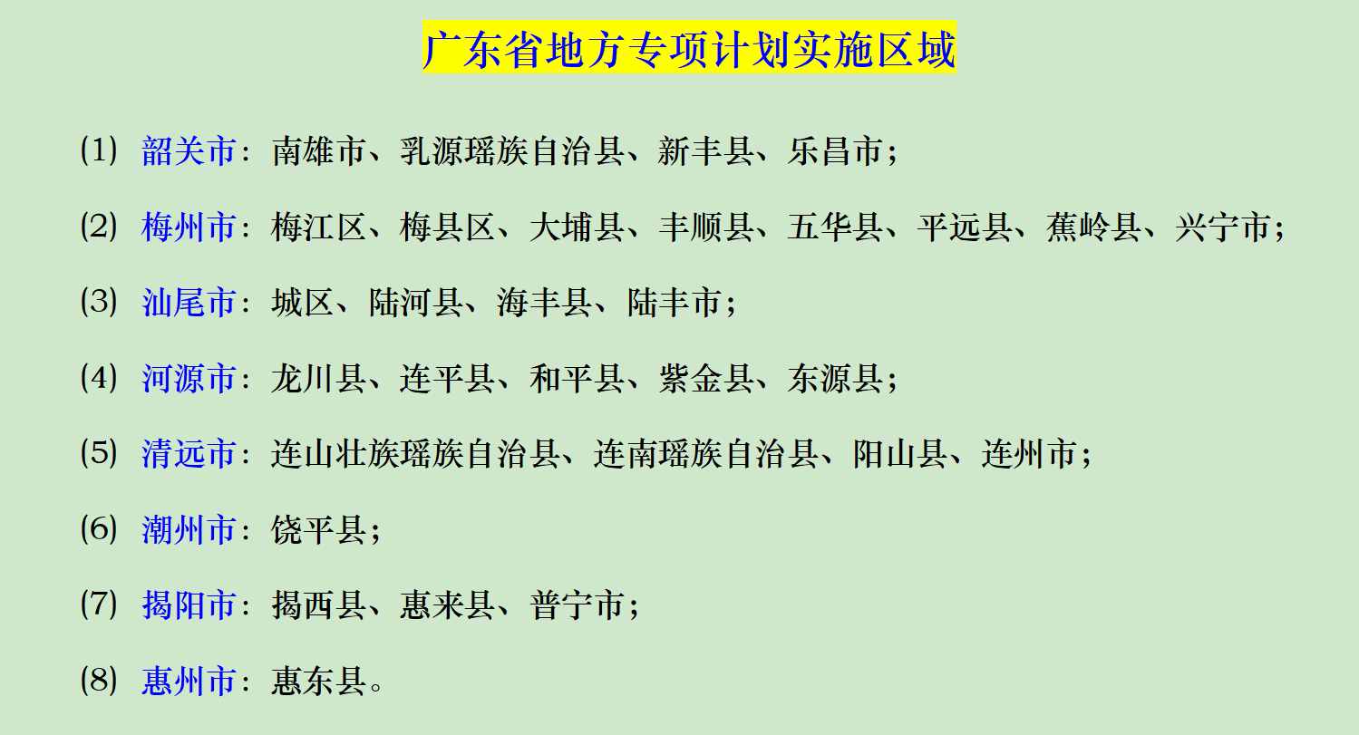 地方专项计划在广东省的实施区域为韶关市、汕尾市、梅州市、河源市、清远市、潮州市、揭阳市、惠州市,这8个地级市之中的部分区县,这些地区为当地农村学生提供了更多的升学机会。