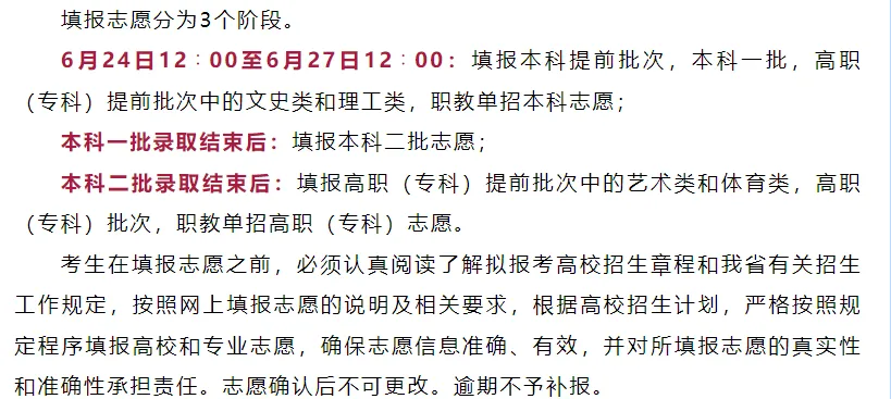 本科提前批、高职高专提前批志愿填报时间:2024年6月25日15:00至29日10:00。